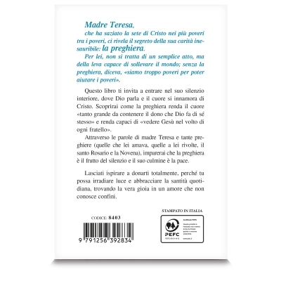 Attraverso le parole di Madre Teresa e tante preghiere (quelle che lei amava, quelle a lei rivolte, il santo Rosario e la Novena), si impara che la preghiera è il frutto del silenzio e il suo culmine è la pace. Un libro di preghiere capace di illuminare gli occhi dell’anima per camminare insieme alla “Matita di Dio”, santa Teresa di Calcutta, autentica maestra di preghiera.