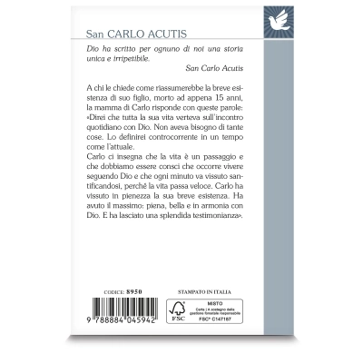 La vita di Carlo Acutis, che sarà canonizzato nel 2025, raccontata in modo documentato, agile e fresco, così come giovane e brillante è la santità di Carlo. Il libro è diviso in tre parti: la prima ripercorre la vita di Carlo; la seconda approfondisce la sua ricca spiritualità incentrata sull’Eucaristia; la terza illustra le mostre di cui fu ideatore, visibili oggi su internet. Un’ampia appendice contiene, inoltre, i paragrafi che papa Francesco ha dedicato a Carlo nell’esortazione apostolica “Christus vivit” e documenta, attraverso le omelie e molte fotografie, la traslazione del corpo di Carlo ad Assisi (5-7 aprile 2019) e la cerimonia della beatificazione (10 ottobre 2020); un’ultima sezione è dedicata al decreto della canonizzazione, promulgato il 23 maggio 2024.