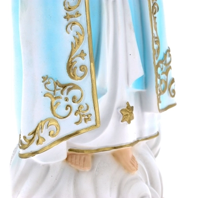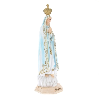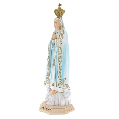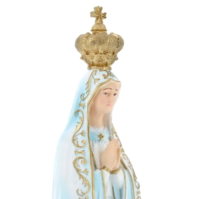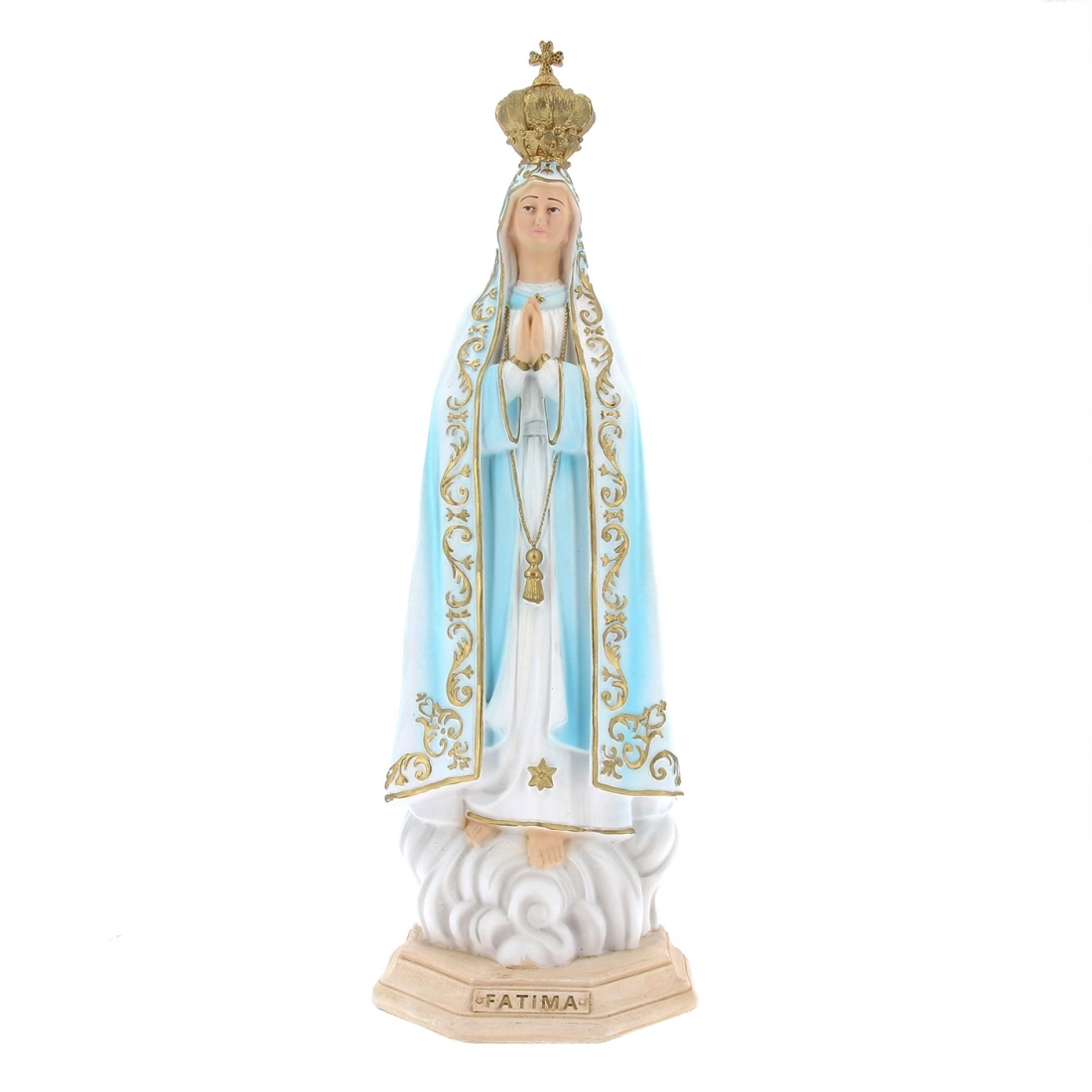 Bellissima statua della Madonna di Fatima (dell'altezza di 40 cm) realizzata interamente in resina colorata, dotata di medaglia di Fatima in metallo argentato e base di appoggio. Ideale per essere esposta in qualsiasi ambiente domestico. Realizzata in Italia con innovative ed avanzate tecnologie, da un'azienda esperta nel settore.