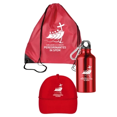 Il kit è disponibile in tre diversi colori: blu, verde e rosso. Ciascuno degli accessori presenta il logo del Giubileo 2025 insieme al motto Peregrinantes in Spem – Pellegrini di Speranza in bianco.