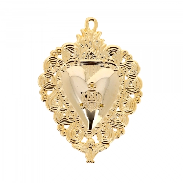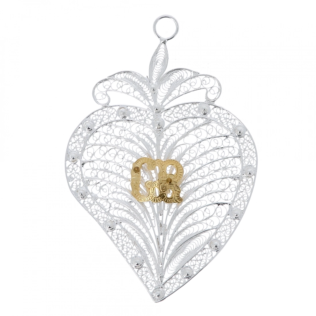Elegante cuore votivo in filigrana d'argento, realizzato con lavorazione artigianale di alta qualità. Il design traforato, ricco di dettagli, mette in risalto al centro il raffinato monogramma dorato "GR" Grazia Ricevuta. Sulla parte alta, il cuore è dotato di un anellino, che permette di appenderlo in qualsiasi ambiente domestico.