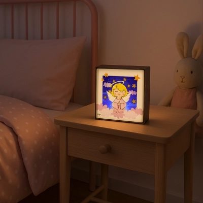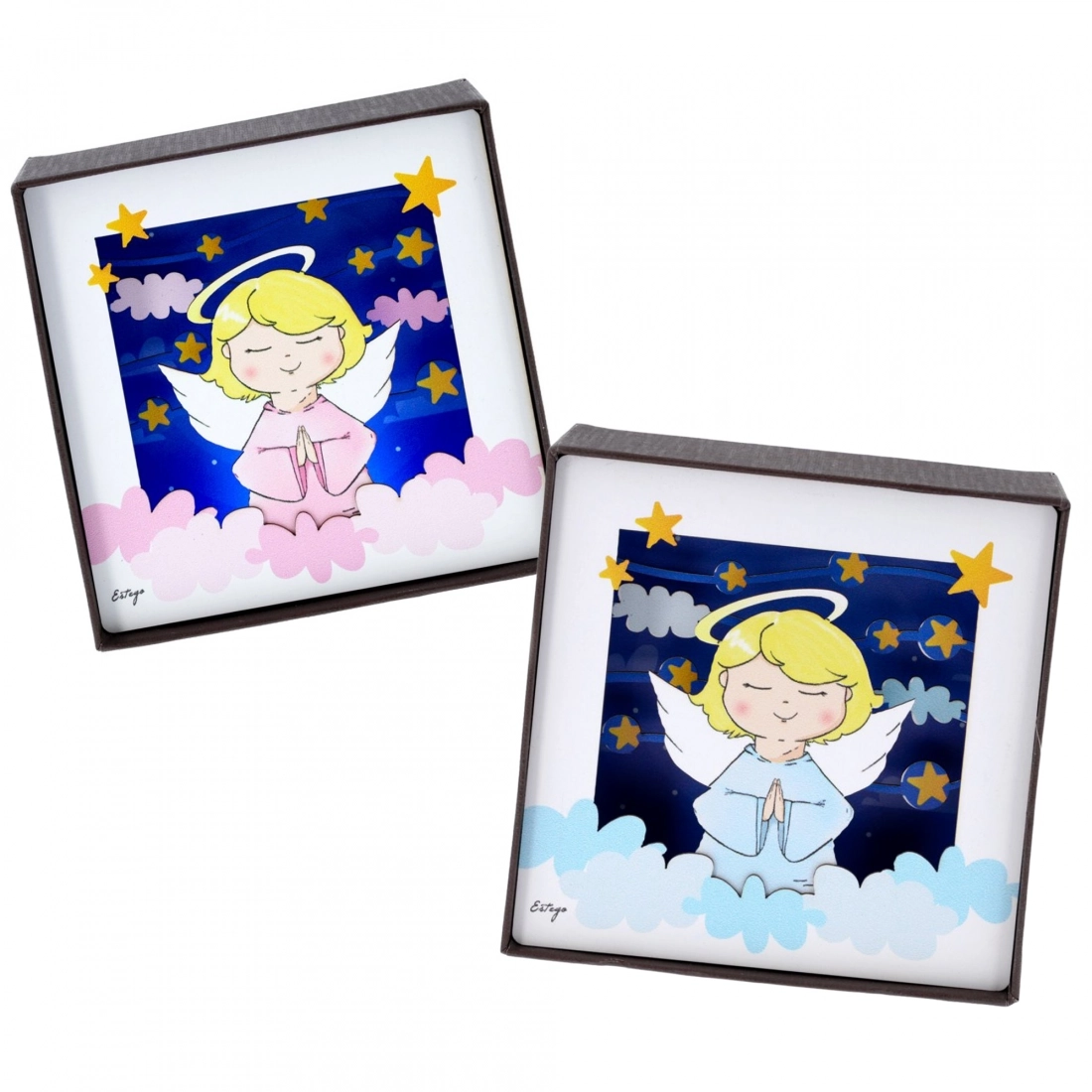 Originale quadro tridimensionale in scatola, con soggetto Angelo, disponibile nelle versioni rosa e celeste. Il quadro si presenta come una semplice ed elegante scatola, ma quando si toglie il coperchio si scopre che in realtà è un bellissimo quadretto, particolare per la sua tridimensionalità, infatti è sviluppato su tre livelli: un livello in cui è illustrato lo sfondo e altri due livelli per i personaggi. Funge anche da lampada da compagnia, in quanto è dotato di una lucina che funziona con le batterie e con un pulsante di accensione e spegnimento. Ideale da regalare in occasione di una Nascita o per qualsiasi altro evento o come arredo per la cameretta.