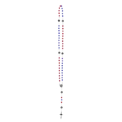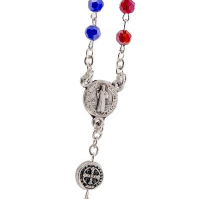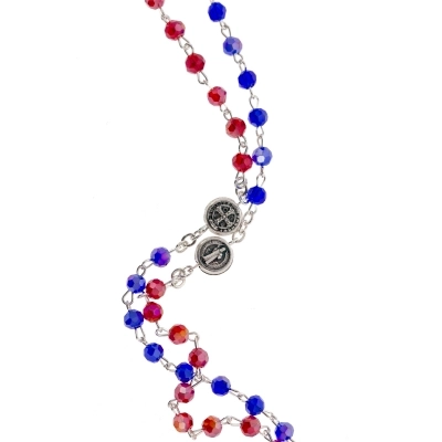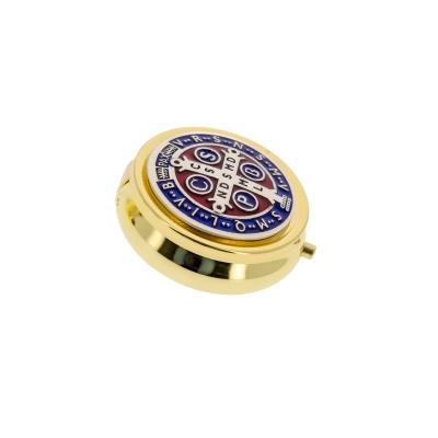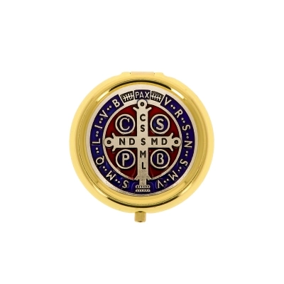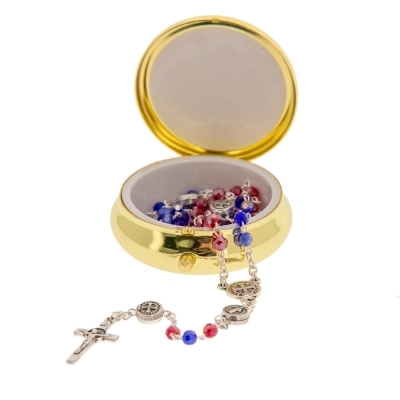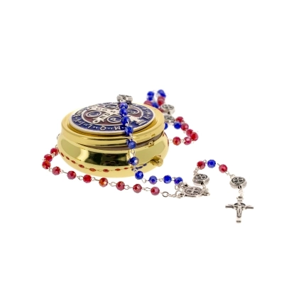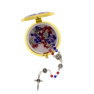 Scatola porta rosario tondo con placca croce San Benedetto in metallo con finitura oro e smaltato. All' interno è presente una corona del rosario con grani in simil cristallo da 0,3 cm di colore rosso e blu e medaglie di San Benedetto come crociera e Pater. Oggetto di pregio, ideale da portare sempre con sè.