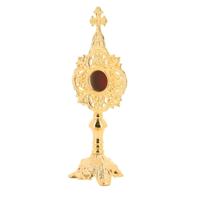 Reliquiario in stile barocco realizzato in ottone dorato e finemente intarsiato, lavorato a mano. La teca centrale tonda, rivestita di vellutino rosso, è sorretta da un fusto con base decorata. La teca è avvolta da una cornice che ricorda un quadrifoglio. Sull'estremità una croce conferisce al reliquiario eleganza e solennità.