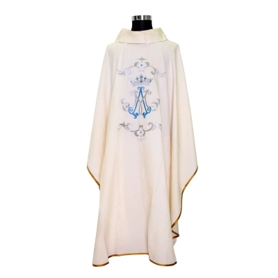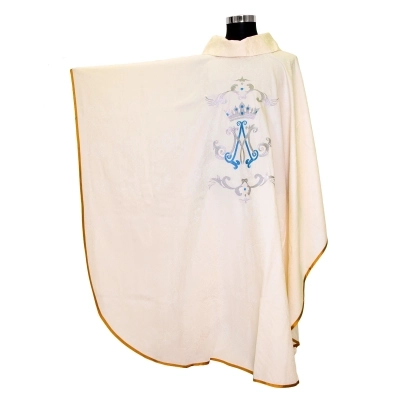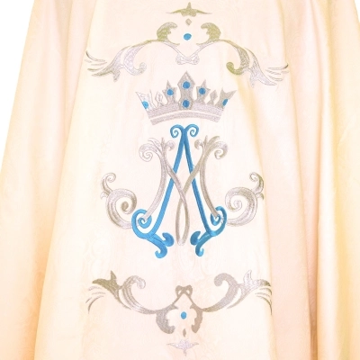 Casula sacerdotale mariana in tessuto 100% poliestere, decorata con ricamo diretto sia sul fronte che sul retro della M di Maria. Il tessuto damascato la rende particolarmente elegante, ideale per le celebrazioni di rilevanza. La casula è completa di relativa stola. Prodotto in Italia, da un'azienda di artigiani esperti.