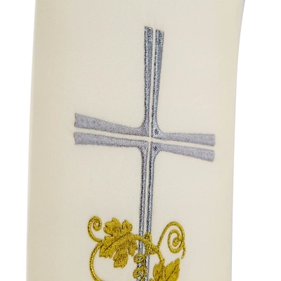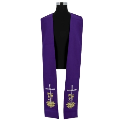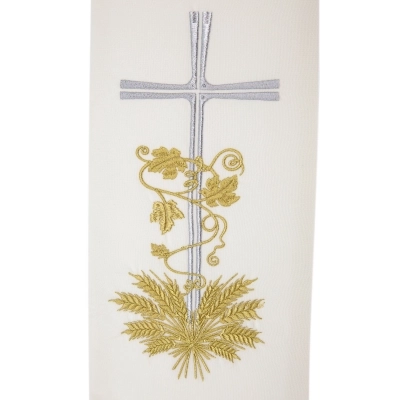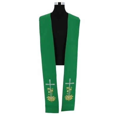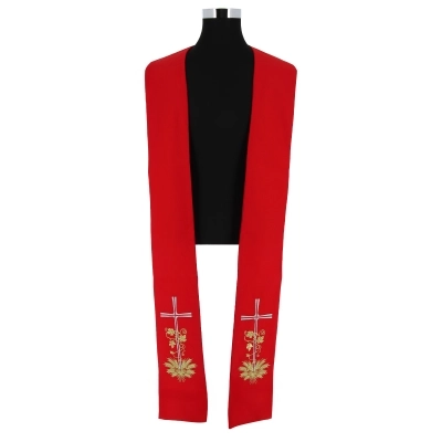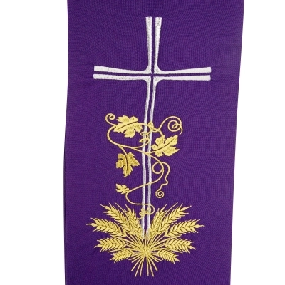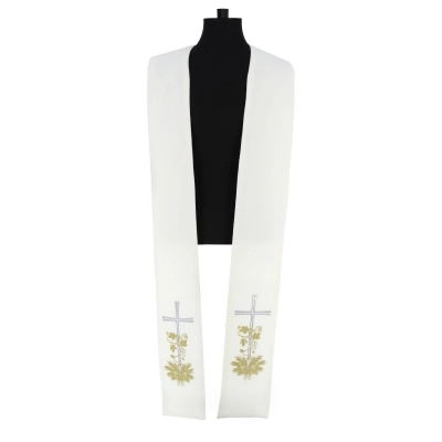 Stola sacerdotale semplice e raffinata, in poliestere, decorata alle estremità con il ricamo di una croce in filo argentato, con delle spighe e la vite in filo dorato. Disponibile nei quattro colori di rito: avorio, verde, viola e rosso. La lunghezza della stola è di 246 cm, ideata per arrivare ben oltre al ginocchio del sacerdote che la indossa.
