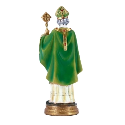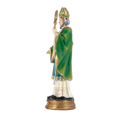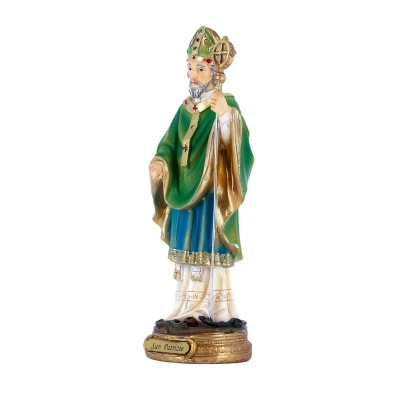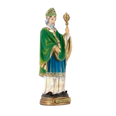 Statua di San Patrizio, in resina decorata, dall'altezza di 19,8 cm. La statua rappresenta San Patrizio vescovo e missionario celtico di origine romano-britannica, patrono dell'Irlanda. Molto noto in Irlanda, dove il 17 marzo, data della sua morte, si celebra la sua ricorrenza. San Patrizio è noto per aver portato il Cristianesimo in Irlanda e averne convertito tantissimi irlandesi, fondando scuole, monasteri e chiese.