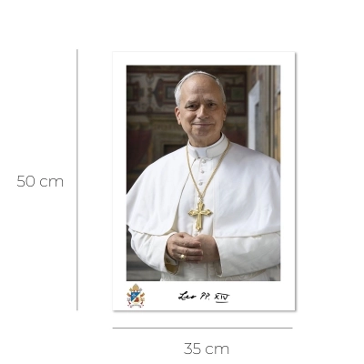 Foto ufficiale di Papa Leone XIV stampata a colori fronte retro con stemma e frase in lingua italiana.