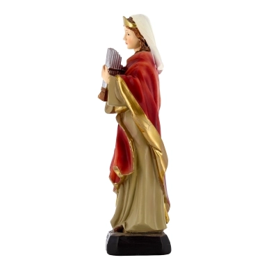 Graziosa e dettagliata statua in resina che raffigura Santa Cecilia. Santa Cecilia è una santa venerata dalla Chiesa cattolica e considerata la patrona dei musicisti. È nota per la sua fedeltà alla fede cristiana e per il suo martirio nel III secolo. Secondo la tradizione, Santa Cecilia era una nobile romana che, nonostante fosse promessa in sposa a un pagano, mantenne la sua verginità consacrata a Dio. Fu imprigionata e martirizzata per la sua fede, ma secondo la leggenda, durante il suo martirio continuò a cantare a Dio. La sua festa viene celebrata il 22 novembre.