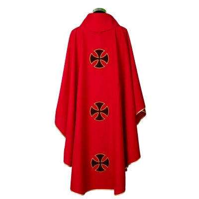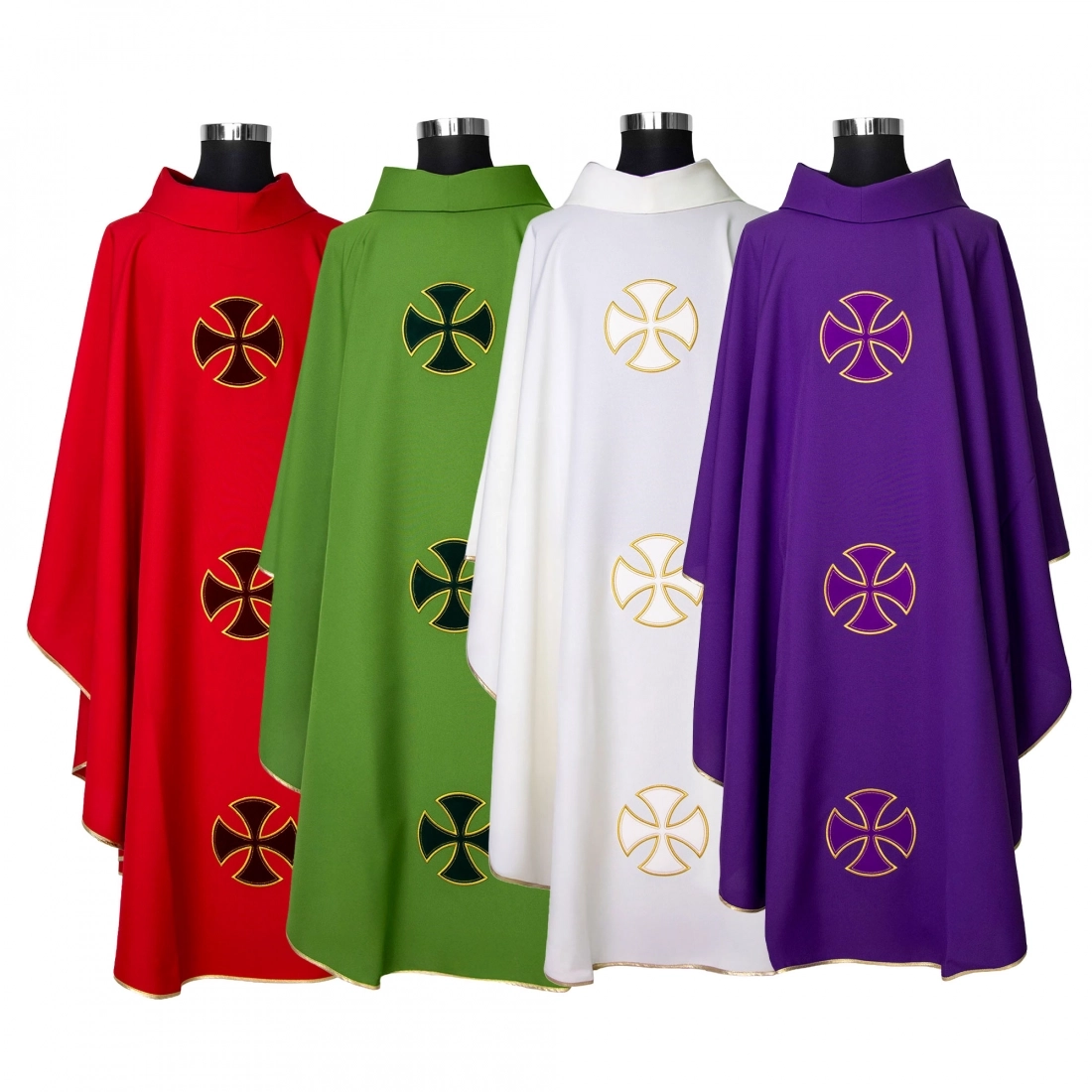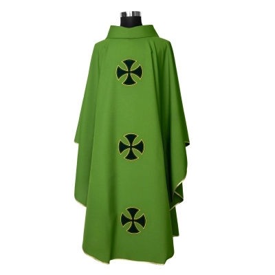 Casula sacerdotale 100% poliestere, presenta sia sul fronte che sul retro 3 croci in velluto, tono su tono con il colore del tessuto della casula, applicate tramite ricamo diretto con filo dorato. Prodotto interamente in Italia, da un'azienda di artigiani esperti che da molti anni opera nel settore dei paramenti sacri, creando prodotti artigianali e di altissima qualità. Disponibile nei 4 colori liturgici.