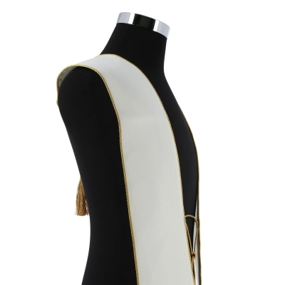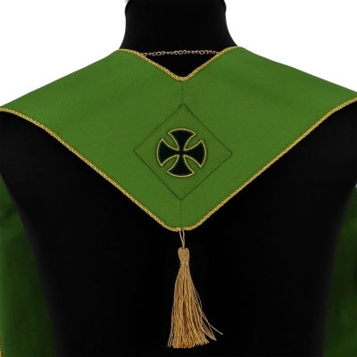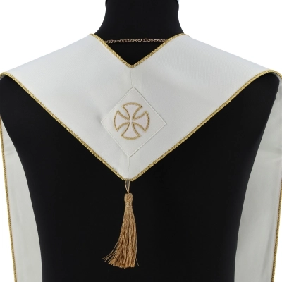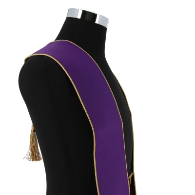 Stola sacerdotale 100% poliestere con croci in velluto, tono su tono con il colore del tessuto della stola, applicate tramite ricamo diretto con filo dorato. Le croce hanno una dimensione di 14x14 cm. La stola è arricchita da frange dorate applicate sui bordi finali. Prodotto interamente in Italia, da un'azienda di artigiani esperti che da molti anni opera nel settore dei paramenti sacri, creando prodotti artigianali e di altissima qualità. Disponibile nei 4 colori liturgici.