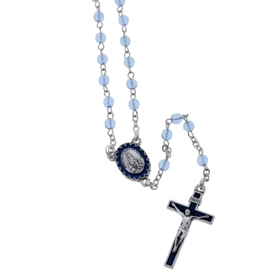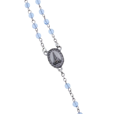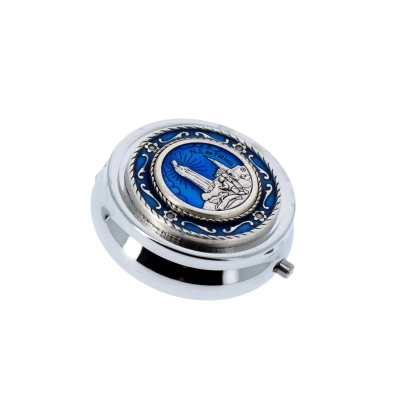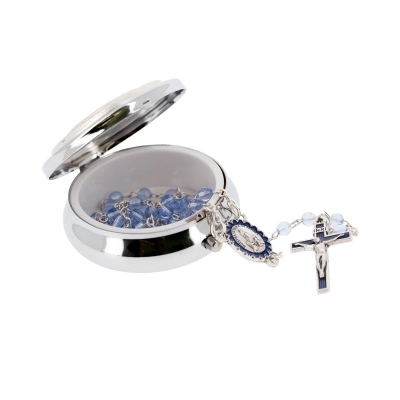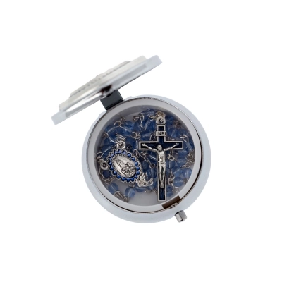 Scatola porta rosario tondo con placca Madonna di Fatima in metallo smaltato blu. Finitura argentata e apertura con bottoncino a scatto. All' interno è presente una corona del rosario con grani da 0,3 cm di colore celeste e crociera abbinata alla scatolina. Oggetto di pregio, ideale da portare sempre con sè ma anche da regalare. La scatolina all'interno ha un rivestimento in plastica bianca, per cui si presta anche per essere utilizzata ad esempio come porta-pillole. Questo articolo fa parte di una collezione con numerosi soggetti.