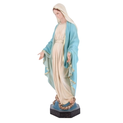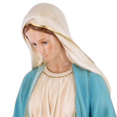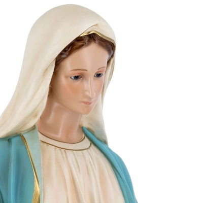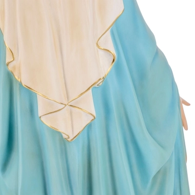Splendida statua raffigurante la Madonna Immacolata, realizzata in vetroresina di alta qualità e finemente dipinta a mano. Alta 107 cm, questa statua si distingue per l’espressione dolce e serena del volto, resa ancora più realistica dalla presenza di occhi in vetro, che donano profondità allo sguardo e una particolare intensità spirituale.
