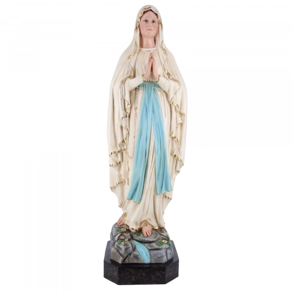 Maestosa statua della Madonna di Lourdes, realizzata in vetroresina resistente e dipinta a mano con grande cura. Alta 135 cm.