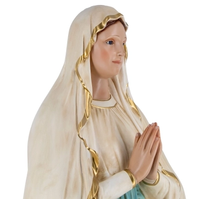 Gli occhi in vetro, applicati con perizia artigianale, donano al volto un’intensità e un’espressione di dolcezza che invitano alla preghiera e alla devozione. Grazie alla combinazione di leggerezza e robustezza della vetroresina, la statua è adatta sia per ambienti interni sia per spazi esterni protetti.