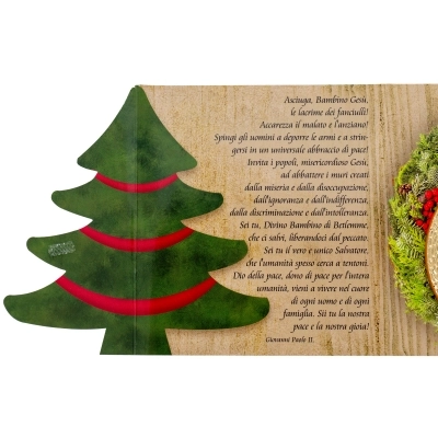 Elegante decorazione natalizia raffigurante la Sacra Famiglia. Il medaglione rotondo presenta un'immagine artistica di San Giuseppe, la Vergine Maria e il Bambin Gesù, simbolo di amore, unione e fede. L'immagine centrale è incorniciata da un bordo decorato in foglia oro e martellato, che dona luce e pregio alla decorazione. Realizzata in materiale resistente con finiture dorate lucide, perfetta per durare negli anni. Dotata di cordoncino dorato per portare un tocco di spiritualità e tradizione all'albero di Natale. Perfetta non solo per decorare la casa durante le festività, ma anche come idea regalo significativa per amici e familiari, essendo dotata di carinissimo packaging in carta con scritta una preghiera a Gesù Bambino di Giovanni Paolo II.