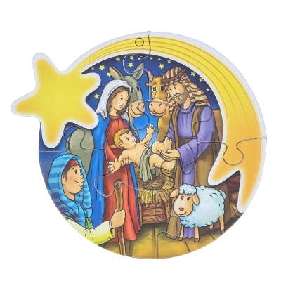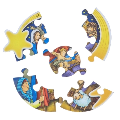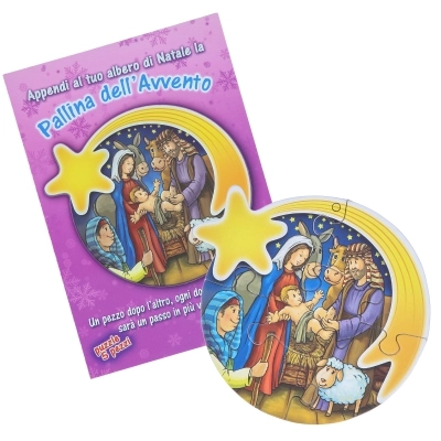 La Pallina dell’Avvento è un originale puzzle natalizio rotondo composto da 5 pezzi in carta, con un diametro di 11 cm, pensato per i bambini. Ogni pezzo viene aggiunto durante una delle domeniche di Avvento, fino a completare la scena della Natività. Il puzzle rappresenta Gesù Bambino, Maria, Giuseppe, il bue e l’asinello, con colori vivaci e dettagli accattivanti per i più piccoli. È contenuto in una confezione colorata che può essere appesa all’albero di Natale, trasformandosi in una bellissima decorazione.
