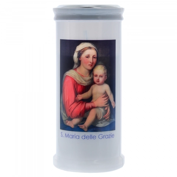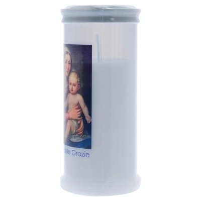 Accendi la luce della speranza con questo lumino votivo dedicato a Santa Maria delle Grazie, titolo mariano che richiama la misericordia e la protezione materna della Vergine Maria. Realizzato in plastica resistente con immagine a colori della Madonna delle Grazie, è un invito a confidare nell’intercessione della Madre di Dio. Ideale per momenti di preghiera e devozione personale, per accompagnare una novena mariana o come offerta votiva in chiesa, cappella o casa.