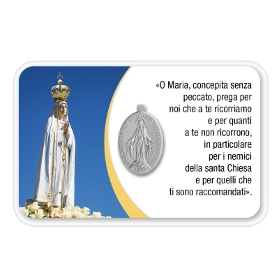 Medaglia Miracolosa realizzata in alluminio color oro, inserita al centro di una card, delle dimensioni di 8,8x5,5 cm. La grafica è moderna e accattivante, molto utile è inoltre la plastificazione che permette alla medaglia e al santino di essere trasportati ovunque, senza il rischio di rovinarsi e stropicciarsi. Questa card è dedicata alla Madonna di Fatima e contiene una bellissima preghiera in italiano.