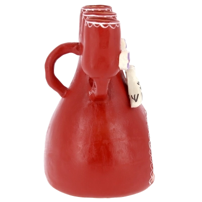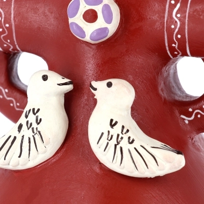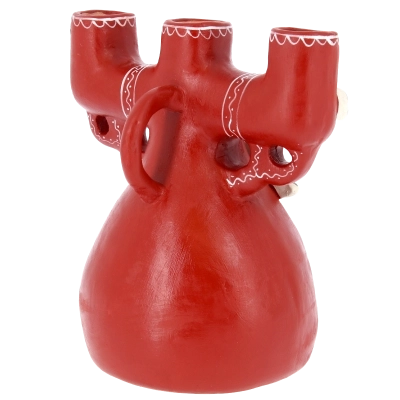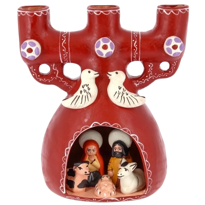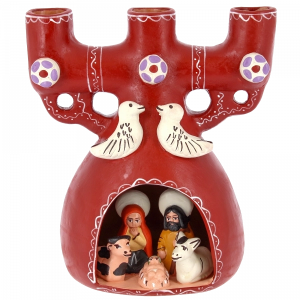 La struttura, in ceramica dipinta a mano, presenta tre alloggi per candele e un presepe in miniatura racchiuso nella parte inferiore. All’interno sono raffigurati Gesù Bambino, Maria e Giuseppe, accompagnati dagli animali del presepe. Nella parte superiore spiccano due colombe stilizzate, simbolo di pace e benedizione, che rendono il pezzo ancora più suggestivo. Questo portacandele etnico non è soltanto un elemento decorativo, ma una piccola opera d’arte che unisce fede, tradizione e artigianato di qualità.