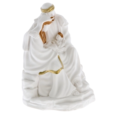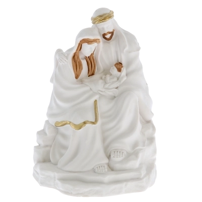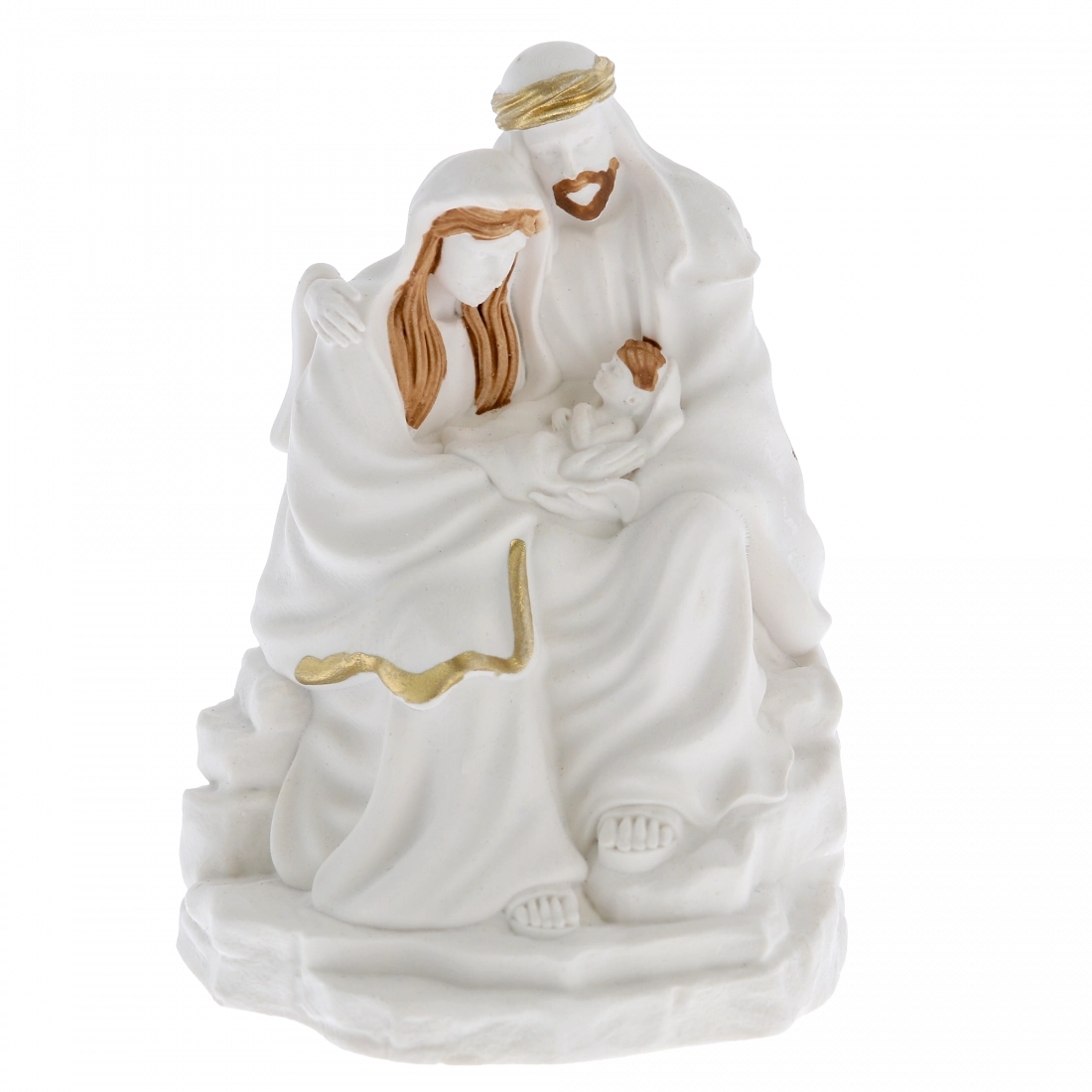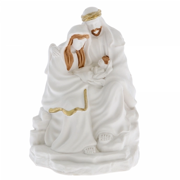 Questa elegante statuina della Sacra Famiglia è realizzata in una finitura bianca satinata con delicati dettagli dorati, perfetti per donare un tocco di raffinatezza alle decorazioni natalizie. E' rafigurata Maria, Giuseppe e il Bambino Gesù in un tenero abbraccio, simbolo di pace e amore familiare.