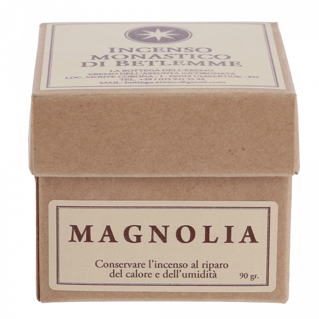L’incenso grezzo naturale proviene dal Mali. Dopo essere frantumato e polverizzato, viene miscelato con essenze profumate liquide per ottenere una pasta profumata, successivamente tagliata in piccoli pezzi tramite una semplice macchina artigianale. I granuli di incenso vengono poi essiccati nel talco per diverse settimane, fino a raggiungere la consistenza ideale. L’intero processo produttivo avviene nel laboratorio del monastero ed è svolto manualmente da un monaco, rendendo ogni confezione un prodotto autentico di incenso religioso artigianale.