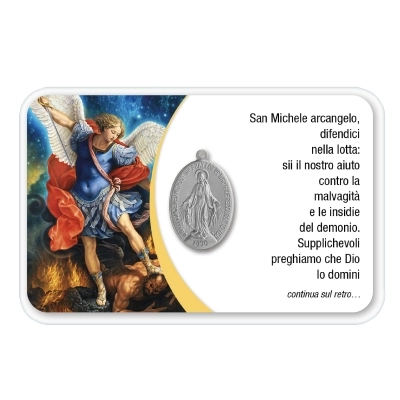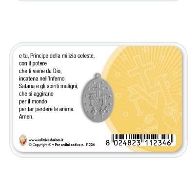 Medaglia Miracolosa realizzata in alluminio color oro, inserita al centro di una card, delle dimensioni di 8,8x5,5 cm. La grafica è moderna e accattivante, molto utile è inoltre la plastificazione che permette alla medaglia e al santino di essere trasportati ovunque, senza il rischio di rovinarsi e stropicciarsi. Questa card è dedicata a san Michele Arcangelo e contiene una preghiera in italiano rivolta a lui.