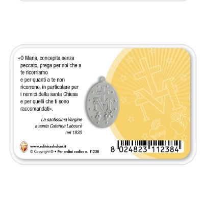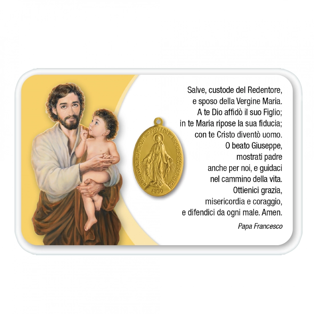 Medaglia Miracolosa realizzata in alluminio color oro, inserita al centro di una card, delle dimensioni di 8,8x5,5 cm. La grafica è moderna e accattivante, molto utile è inoltre la plastificazione che permette alla medaglia e al santino di essere trasportati ovunque, senza il rischio di rovinarsi e stropicciarsi. Questa card è dedicata a san Giuseppe e contiene una preghiera in italiano rivolta a lui.