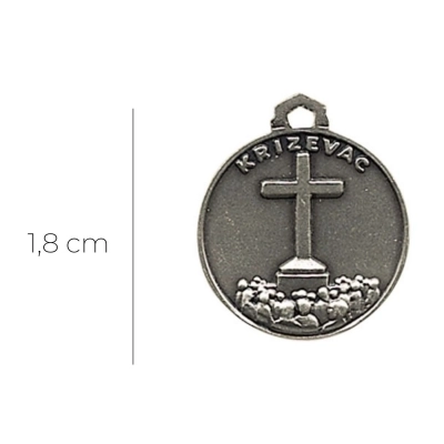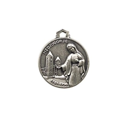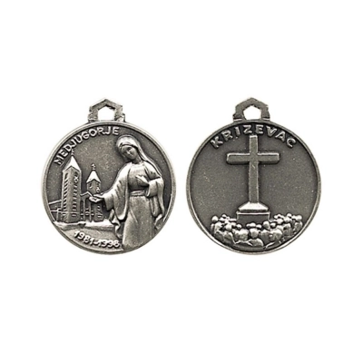 Bellissima medaglia di Medjugorje in ottone, dal diametro di 1,8 cm, raffigurante la Madonna con affianco la basilica di Medjugorje e sul retro la croce posta sulla cima del Monte Krizevac, dove i pellegrini nel salire ripercorrono tutte le tappe della Via Crucis. La medaglia è dotata di anellino per poter essere appesa ad una catenina ed indossata al collo (catenina non inclusa). La medaglia è estremamente dettagliata e rifinita con cura. Realizzata appositamente per Editrice Shalom, che ne ha seguito direttamente tutta la lavorazione, dalla scultura in plastilina fino alla realizzazione del primo modello. Rigorosamente ideata e prodotto in Italia da un'azienda artigianale e leader nella produzione di medaglie.