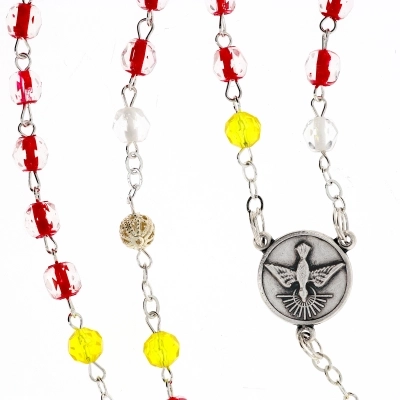 La corona è composta da 5 poste di 7 grani in vetro trasparente con anima rossa o bianca e da un grano giallo di diametro 6 mm. La crociera raffigura lo Spirito Santo. Sulla medaglia finale è raffigurato Gesù Misericordioso.