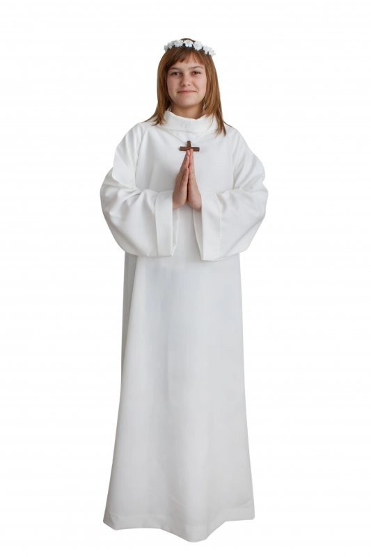 Veste per Prima Comunione, adatta per maschi e femmine, realizzata in 100% poliestere, di colore bianco a tinta unita senza alcun decoro. La tunica è semplice ed economica, ha un taglio svasato con il collo rivoltato e il finto cappuccio, la manica larga. L'abito è disponibile in varie misure standard, per consultarle vedi la tabella tra la foto del prodotto (disponibilità di ordinare dalla taglia 100 alla 135, con uino scarto di 5 cm).