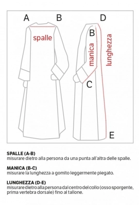 Veste per Chierichetti, adatta per maschi e femmine, realizzata in 100% poliestere, di colore bianco a tinta unita con due piegoni davanti e dietro e con applicato un elegante bordino rosso, anche sulle maniche. L'abito è disponibile in varie misure standard con la possibilità di avere delle misure personalizzate, consultare la tabella e lo schema presente tra le foto del prodotto. Realizzata e confezionata interamente in Italia.