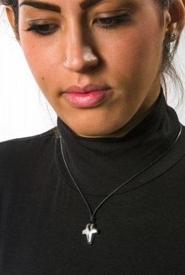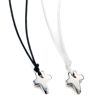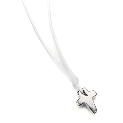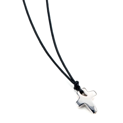 Collana in corda cerata e argento 925 rodiato lunghezza 45+3 cm di allungo e chiusura con moschettone, con ciondolo croce in argento rodiato, bombato, delle dimensioni di 2x1,5 cm. Prodotto artigianalmente in Italia da un'azienda specializzata nella realizzazione di articoli in argento. Colori disponibili: nero e bianco.