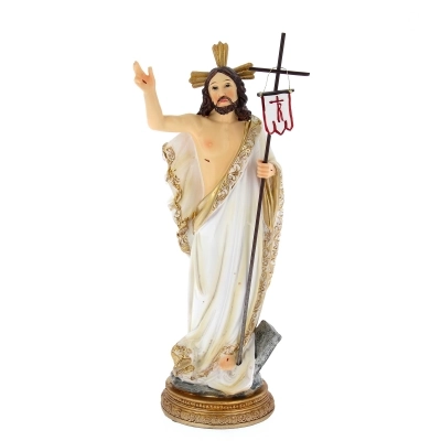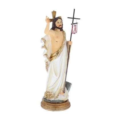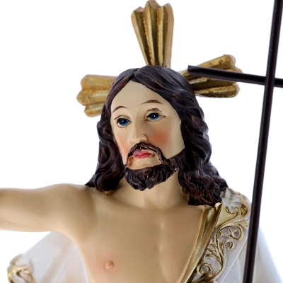 Graziosa e dettagliata statua che raffigura Gesù Risorto che regge la bandiera bianca con la croce rossa, vessillo della vittoria pasquale. La statua, dai colori brillanti, è adatta da esporre sia in qualsiasi ambiente domestico. La Resurrezione di Gesù è il punto cardine nella narrazione dei Vangeli e del Nuovo Testamento. Per il Cristianesimo l'evento è il principio e fondamento della fede, ricordato annualmente nella Pasqua e settimanalmente nella domenica.