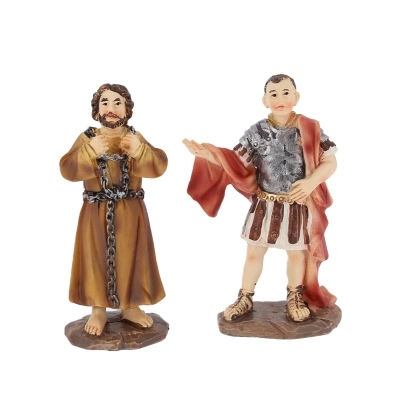 Bellissima rappresentazione del Processo a Gesù, composta da 4 statuine, in resina dipinta, di altezza variabile tra gli 8,8 cm e i 9,5 cm, che raffigurano Gesù condannato, Ponzio Pilato, un soldato e un altro condannato.
