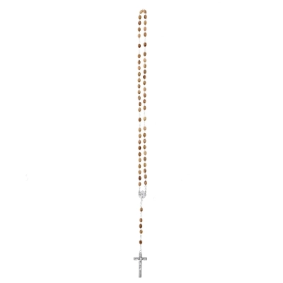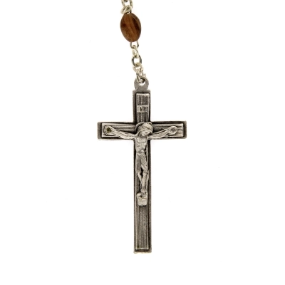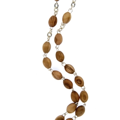 Corona del Rosario con grani ovali in legno d'olivo, di dimensioni 7x3 mm. Croce e crociera sono in metallo e sulla crociera è raffigurata la medaglia Miracolosa. Anche se non è dotata di gancetto che ne consente l'apertura, la corona è comunque indossabile al collo. Bellissima idea regalo, per donare un prodotto di qualità cn un grandissimo valore spirituale. Ideale anche da uomo. Leggera e comoda da indossare quotidianamente e pratica per recitare il Santo Rosario.