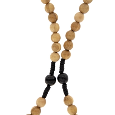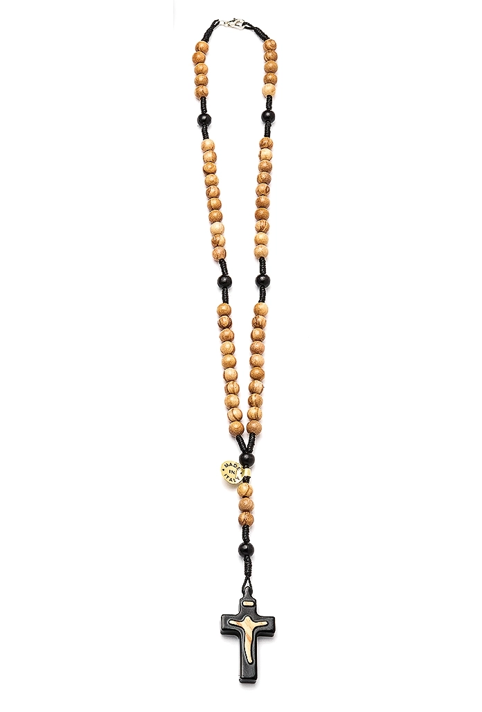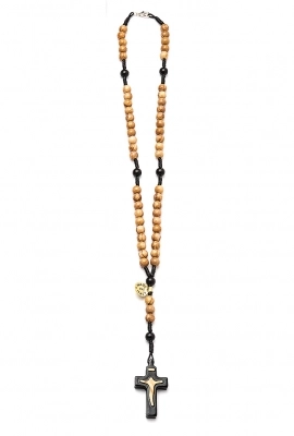 Corona del Rosario in corda e grani in legno d'ulivo dal diametro di 7 mm. La corona è indossabile grazie al gancetto, posto in alto, che ne consente l'apertura. Bellissima la scelta di apporre al rosario questo contrasto di colori: la colorazione tipica del legno d'olivo con tutte le sue venature e la verniciatura scura che è stata effettuata sui grani in cui si recita il Padre Nostro e sulla croce. Adatta anche come idea regalo per uomo. Prodotto interamente realizzato in Italia con materiali di alta qualità, da un'azienda esperta nella lavorazione del legno d'ulivo, che viene lasciato riposare diversi anni prima della lavorazione per consentire maggiore resistenza al prodotto finito.