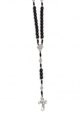 Bellissima corona del Rosario in corda con grani ovali in legno da 11 mm. I grani in cui si recita il "Padre Nostro", la crociera e la croce finale sono in metallo. Questa corona si definisce di san Benedetto in quanto presenta sia croce che crociera con la medaglia di san Benedetto. Anche se non è dotata di apertura, è possibile indossarla comodamente. Ideale come regalo, in quanto fornita in una bustina trasparente completa di biglietto in cui viene spiegata la devozione alla medaglia di San Benedetto.