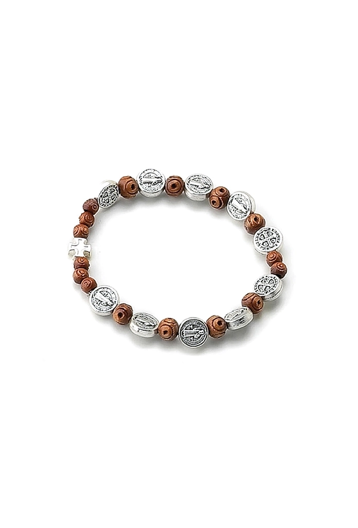 Bracciale elastico composto da 10 medaglie di san Benedetto, con diametro 10 mm, intervallate da grani in legno decorato, di diametro 7 mm. Il bracciale ha anche una piccola crocetta in metallo delle dimensioni di 10x10 mm. Il tutto montanto su un elastico molto resistente e che lo rende adattabile a tutti i polsi. Comodo e pratico da indossare tutti i giorni e utile per poter pregare il Santo Rosario.