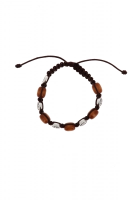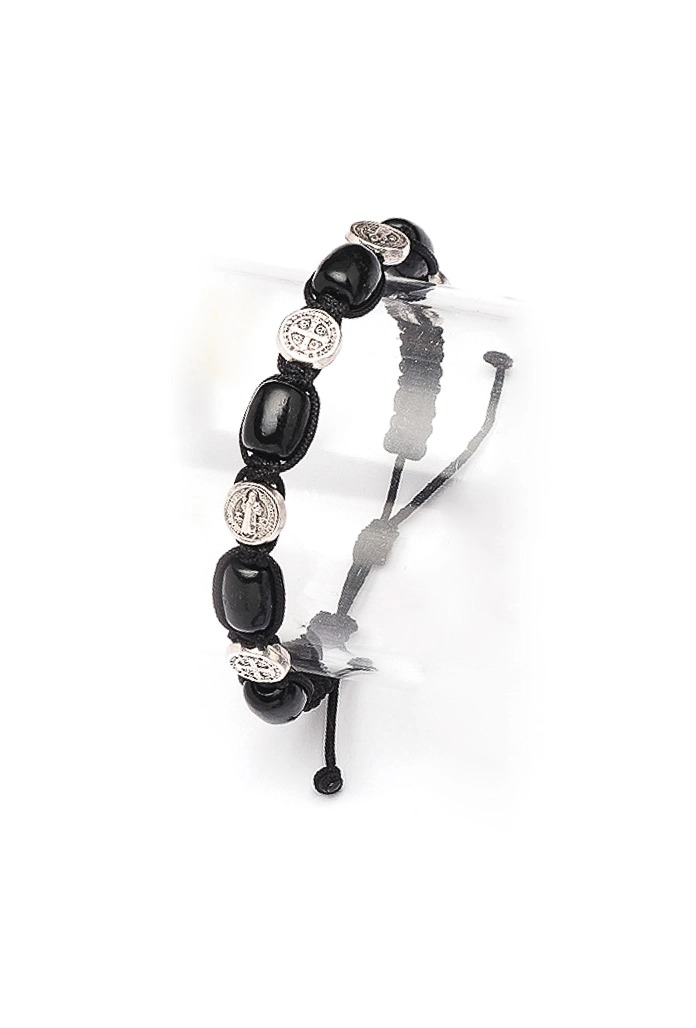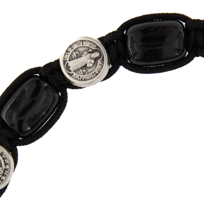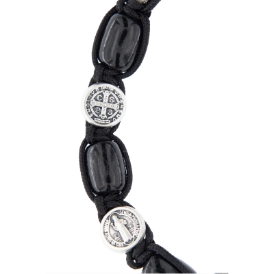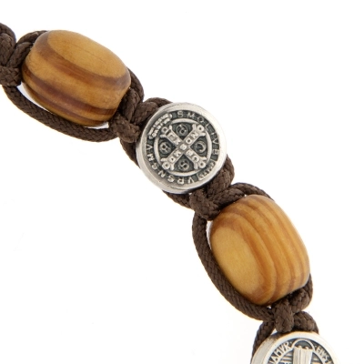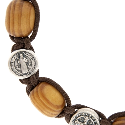 Bracciale in corda composto da 10 grani in legno a forma di cilindro con dimensioni 11x6 mm, che rappresentano proprio una decina del rosario. Questi sono intervallati da medaglie di San Benedetto tonde del diametro di 10 mm. Comodo e pratico da indossare tutti i giorni e utile per poter pregare il Santo Rosario. Ideale anche per uomo. Carinissima idea regalo, fornito in una bustina trasparente completa di bigliettino con la spiegazione della devozione al santo. Grazie al nodo a scorrimento il bracciale è adattabile a tutti i polsi.