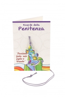 Carinissimo ciondolo crocetta in polimero, effetto ceramica, con raffigurazione stilizzata di Cristo che abbraccia il fedele, come segno di Perdono e Riconciliazione. Grazie ad un cordoncino lilla, dalla lunghezza di 35 cm, è possibile indossarla al collo. E' confezionata in una bustina con bigliettino come ricordo della Confessione con una piccola preghierina. Potrebbe essere una carinissima idea regalo per lasciare un ricordo di grande valore ai bambini che si apprestano a ricevere questo importantissimo Sacramento.