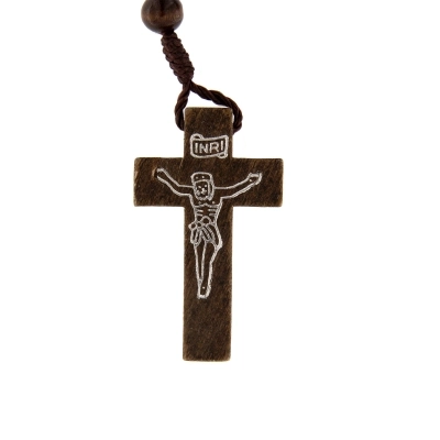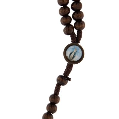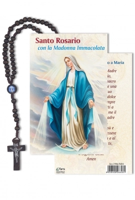 Corona del Rosario in corda, con grani tondi in legno scuro da 6 mm. La crociera, in legno, presenta una raffigurazione della Madonna Immacoltata. Viene fornita confezionata in una bustina trasparente completa di biglietto con la Madonna Immacolata e all'interno ci sono i misteri e le litanie lauretane. Ideale da regalare a chi è particolarmente devoto alla Madonna Immacolata o da acquistare per diffondere la preghiera più importante: il Santo Rosario.