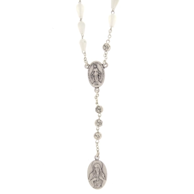 La corona è composta da 7 poste di 7 grani, a forma di lacrima di lunghezza 8 mm, in madreperla bianchi, intervallati da grani, di diametro 6 mm, in metallo a forma di rosellina. La crociera è la medaglia Miracolosa e sulla medaglia finale è raffigurata la Madonna delle Lacrime. I gruppi dei misteri sono sette, uno per ogni giorno della settimana: gioia, luce, dolore, gloria, sapienza, giustizia e misericordia. Le meditazioni parlano delle lacrime d’amore della Madonna per l’umanità, che da sole esprimono la commozione della Madre che vede i suoi figli lontani da Dio.