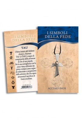 Elegante ciondolo di dimensione 2,5x1,5 cm in acciaio inox, unisex, che ha come soggetto il Tau. Il Tau è l'ultima lettera dell'alfabeto ebraico ed è segno del compimento delle promesse di Dio; è un simbolo di redenzione e di salvezza, particolarmente caro ai Francescani.