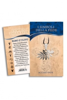 Elegante ciondolo di dimensione 2,5x1,5 cm in acciaio inox, unisex, che ha come soggetto il ramo di ulivo, segno di rigenerazione dopo il diluvio universale e quindi simbolo di pace e riconciliazione di Dio con gli uomini. Comodo da indossare grazie a un cordoncino facilmente regolabile. La pratica confezione, di 6x9 cm, contiene anche una chiara e interessante spiegazione di questo simbolo della fede.