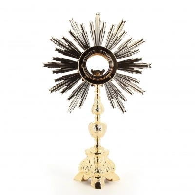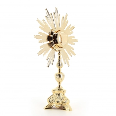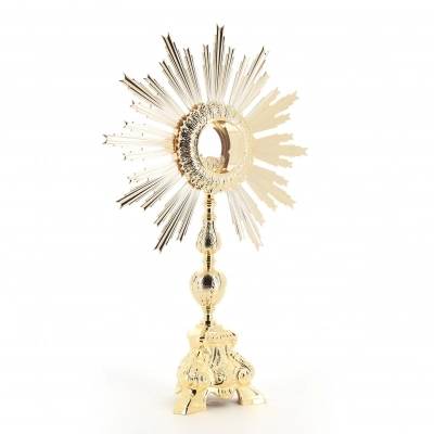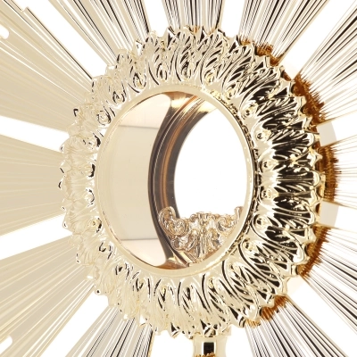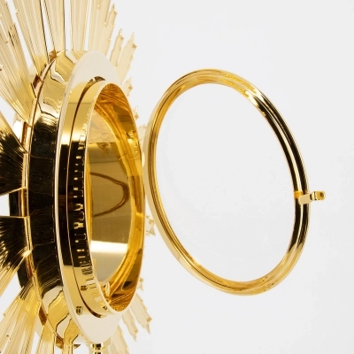 Ostensorio barocco per ostia magna, realizzato in ottone dorato e base in fusione d'ottone lucido e doppio oblò in vetro con sportello posteriore per inserire l'ostia magna con l'apposito accessorio ad incastro. L'ostensorio grezzo in ottone viene prima nichelato poi palladiato e dorato in oro zecchino. Articolo pregiato e di ottima fattura, ricorda un piccolo sole con i raggi che circondano il centro dove viene collocata l'ostia.