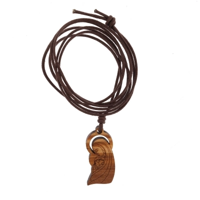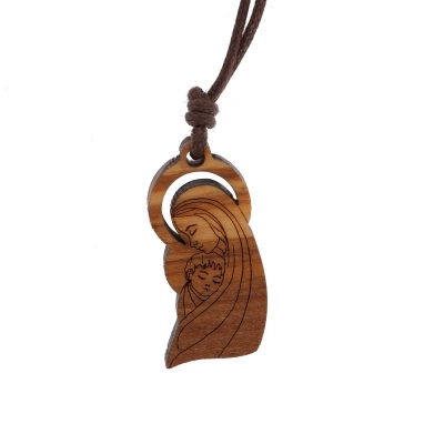 Ciondolo in legno d'olivo, dall'altezza di 2,5 cm, sagomato con Madonna con Bambino e su cui sono incisi i particolari. Il ciondolo è completo di cordoncino dalla lunghezza di circa 40 cm, utile per indossarlo al collo. Simpatico da donare ai bambini e ragazzi del catechismo. Prodotto in Italia.