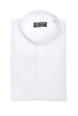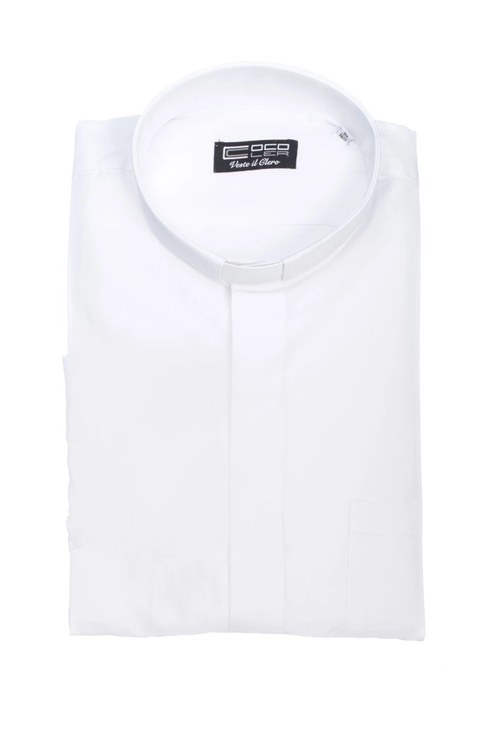 Camicia bianca con collo clergy, a mezza manica, realizzata in cotone con una piccola percentuale di poliestere per renderla più duratura nel tempo e per facilitarne il lavaggio e la stiratura. Ha una vestibilità ottima e il tessuto garantisce comodità e freschezza. Ha un comodo taschino posto nella parte sinistra, doppio bottone sul polsino e i bottoni posti sul davanti sono coperti dal tessuto della camicia stessa. Realizzata interamente in Italia con materiali di primissima qualità e provenienti dall'Italia o paesi dell'Unione Europea, da un'azienda che cura ogni minimo dettaglio con passione e attenzione.