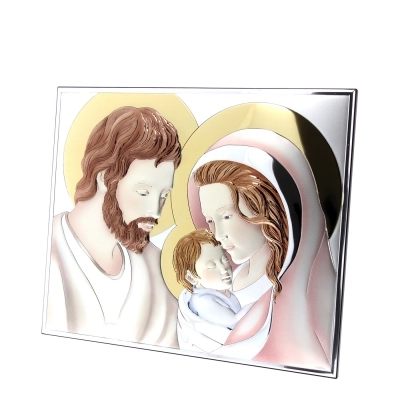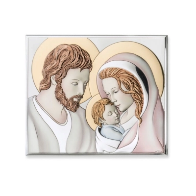 Elegante quadro in argento che rappresenta la Sacra Famiglia. Realizzato in Mirò silver, un nuovo metallo con trattamento superficiale che include uno strato di argento puro 999.95% che conferisce al rivestimento soliditá e resistenza all’ossidazione superiore rispetto ai piu’ comuni rivestimenti in metalli preziosi. Il retro del quadro è in legno ed è dotato di gancetto per essere appeso. Il quadro della Sacra Famiglia raffigura la famiglia di Gesù, composta da Gesù stesso, la Madonna e San Giuseppe. Questa rappresentazione è un simbolo di unità familiare, amore e protezione divina. Nell'iconografia cristiana, la Sacra Famiglia è spesso dipinta in varie scene di vita quotidiana o momenti significativi della loro storia. Dimensioni 32x26 cm