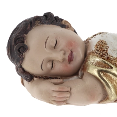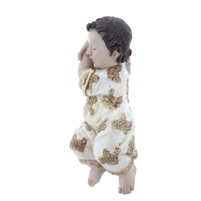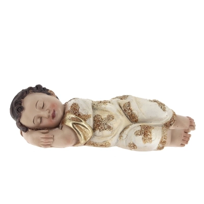 Bellissima e originale statua di Gesù Bambino dormiente, raffigurato con una veste decorata in oro. Ricca di dettagli ben rifiniti e curata nei particolari, la statua è adatta per essere esposta in qualsiasi ambiente domestico, ma anche in luoghi di culto. Adatta come idea regalo da donare in qualsiasi momento e per qualsiasi occasione, ma si arricchisce di valore spirituale soprattutto se regalata nel periodo natalizio.